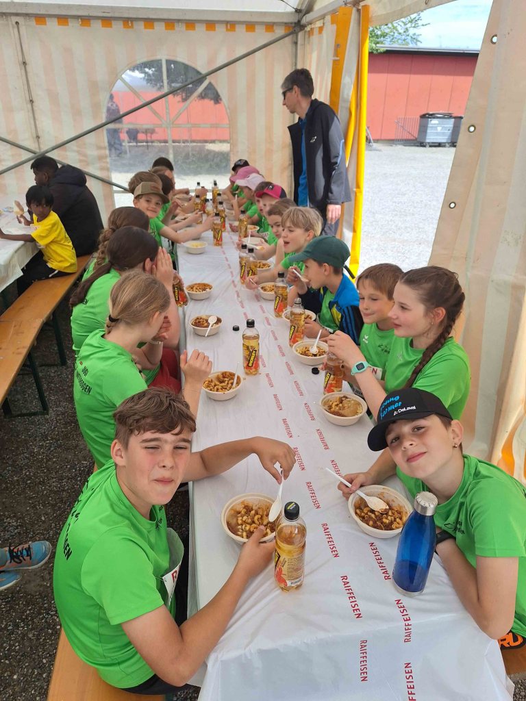 Erschöpft kamen alle ins Ziel und waren froh, dass sie nun das Mittagessen geniessen konnten. Bei Ghackets und Hörnli mit Apfelmus wurde rege über den Morgen diskutiert. Da die Vereinsstafette erst am späten Nachmittag war, gingen einige Kinder nach Hause, andere verweilten auf dem Kellenspielplatz, spielten Fussball oder schauten den anderen Vereinen bei deren Wettkämpfen zu.